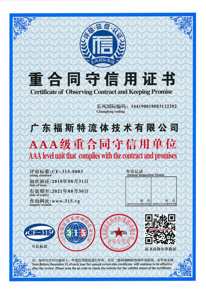 • AAA級(jí)誠(chéng)信經(jīng)營(yíng)示范單位證書(shū)